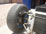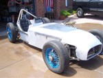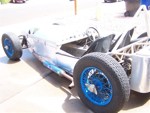 Shown here with a set of 13 inch wires and appropriate skinny tires for 'show' , we retained also the Original blue 13 inch front/15 inch rear set of wires , and had Hoosiers mounted on them for track use. The original fuel tank is shown.
