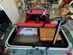 I tried to remove the worn black paint over the lamiplate, but to no avail; hence the dash and side cards were covered in poppy red vinyl. Carpet and hardura boot matt cleaned up the interior.