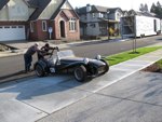 Me (tan cap/red-ish shirt) and the transport driver pushing the car in the into the Oregon garage. Note the pile of boxes in the cockpit and the stock windscreen should ease the process of registration for the street.