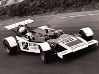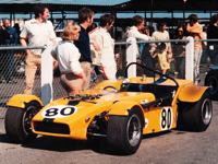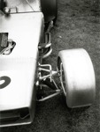 At right is a photograph, courtesy of John Robinson, showing Tim Goss in the paddock at Brands Hatch prior to a race. The car is showing some modification to the bodywork since its original build completion on Christmas Day 1969, and first race at Mallory Park on the following Sunday. Alterations to the nose cone (rivet detail evident) provide a more noticeable slope from the original box like shape. The original front and rear wheel cycle wings of over 180 degrees radius (widened Series 3 wings on the rear of the original) have been replaced.The front wings are held in place by a controversial method whereby the wing is braced with tubing that bolts onto the front stub axles on the inside and outside. John Robinson advised that although this method stabilized the wing, it made it extremely difficult to change the front wheels quickly in the event of an emergency.