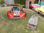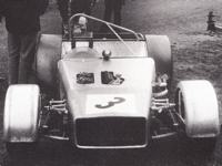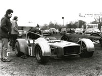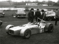 Left: Tim Goss in the driver's seat of the 7X waiting for the 'off' at Brands Hatch. Ken Robinson (constructor/mechanic of the Barry Foley/Robin Hall St. Bruno Roughcutter car) is holding on to the roll bar, John Robinson is next to him, with an unknown gentleman making a point!