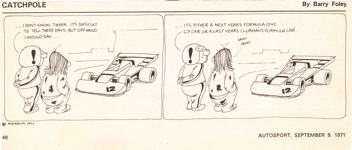John Robinson subsequently sent me some photographs and articles regarding the 7X. The photographs showed modifications to the exterior of the car while still being driven by Tim Goss, with much more pronounced modifications under the ownership of Barry Foley and Robin Hall. The 7X under the latters' ownership came to look much more like the later built St. Bruno Roughcutter car, and was almost unrecognizable from its original form. John also included a "Catchpole" cartoon from 1971 drawn by Barry Foley. In the cartoon, there is a character referred to as "Tweak". This was Barry Foley's affectionate name for his good friend and mechanic, John Robinson.